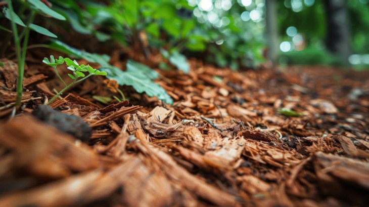 Wood chips and shredded bark from pruned or felled trees make excellent long-lasting mulch for ornamental areas, around trees and shrubs, and for creating attractive garden paths. These materials effectively retain moisture and suppress weeds while slowly breaking down over several years, making them ideal for areas that don't require frequent nutrient replenishment.