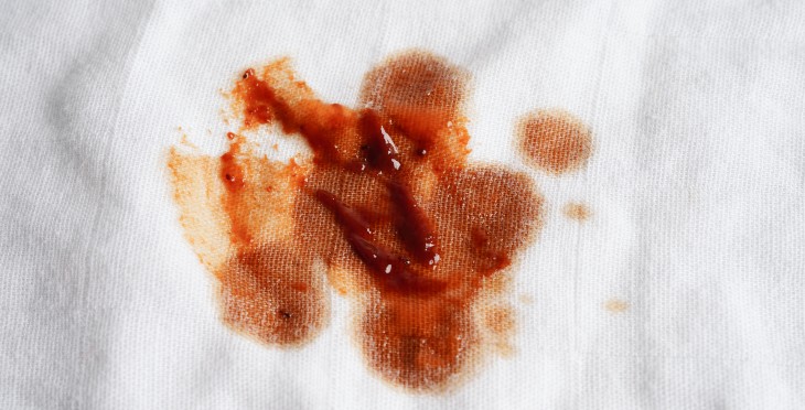 Blood: Rinse the stain with cold water as soon as possible. Apply a small amount of hydrogen peroxide to the stain and let it bubble. Rinse with cold water and repeat if necessary.